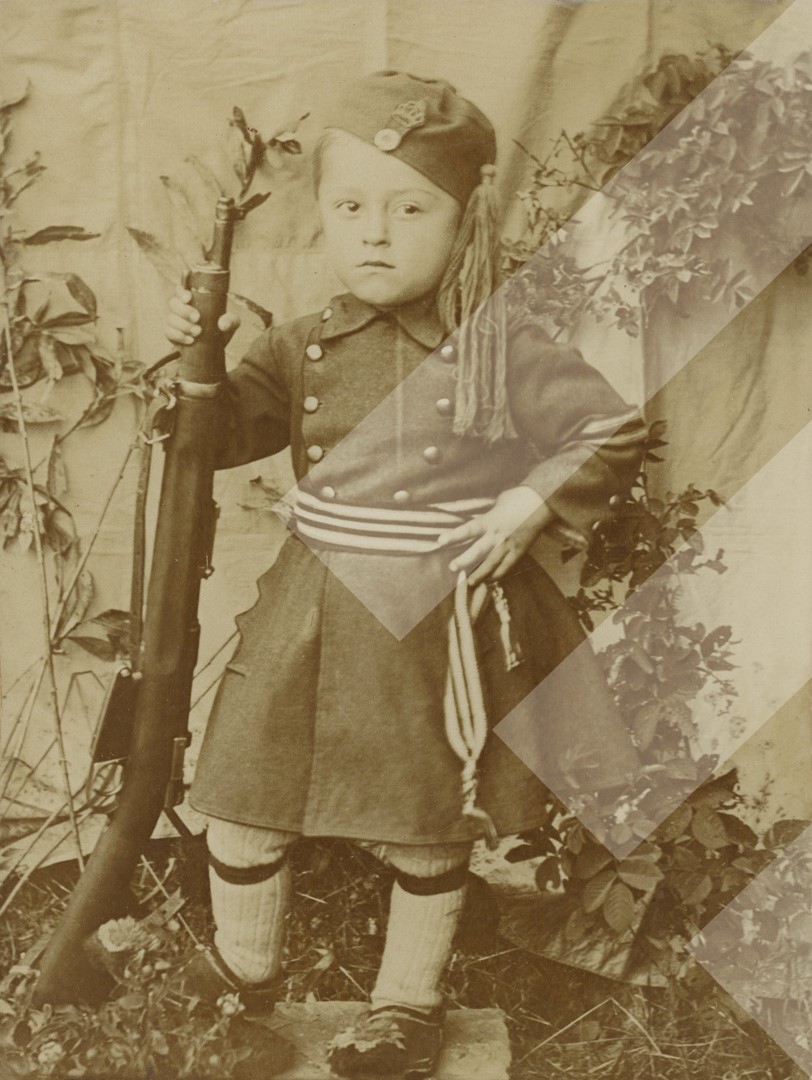 I panjohur, rreth 1910-1915 Fëmijë në pozë me veshje ushtarake greke print në letër, 9 x 12 cm.