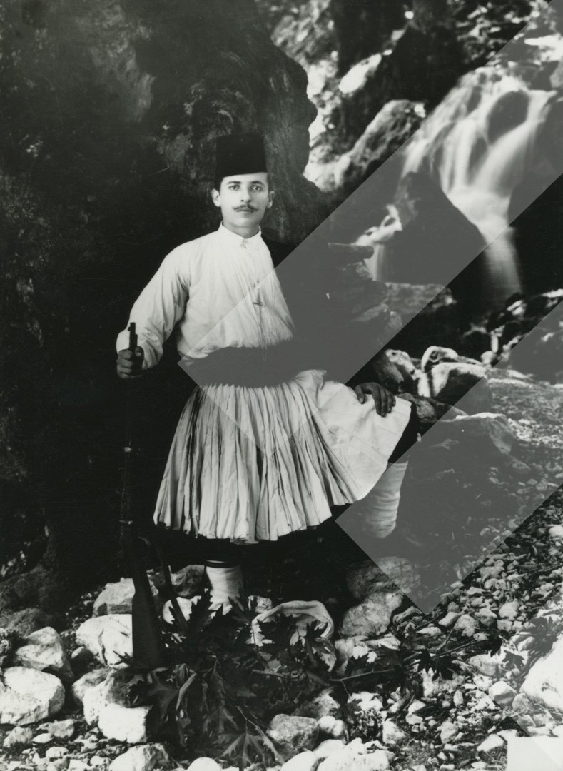 I panjohur, rreth 1915-1920 Burrë me veshje tradicionale nga Jugu print në letër, 9 x 12 cm.