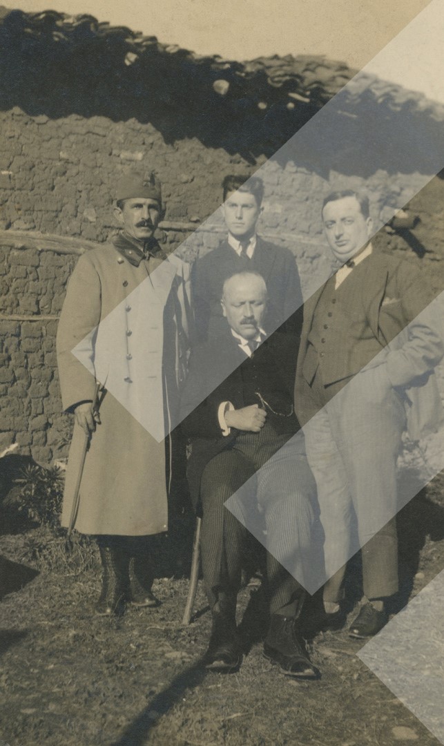 I panjohur rreth 1922 Zyrtarë të institucionit të pronave shtetërore përpara Hanit të Çakallit print në letër, 7 x 11 cm.