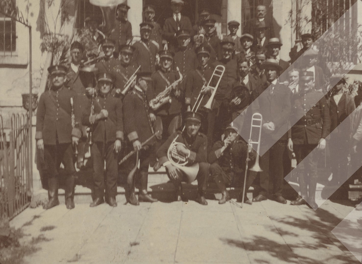 I panjohur, rreth 1930 Bandë frymore në Korçë print në letër, 9 x 12 cm.
