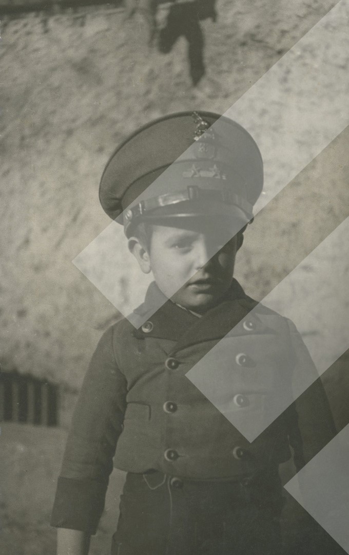I panjohur, 1937, Fëmijë me kapelen e një oficeri shqiptar print në letër,, 9 x 14 cm,.