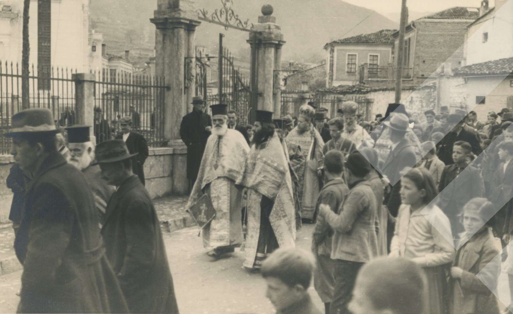 I panjohur rreth 1940-1942 Procesion kishtar në Korçë print në letër, 9 x 14 cm.