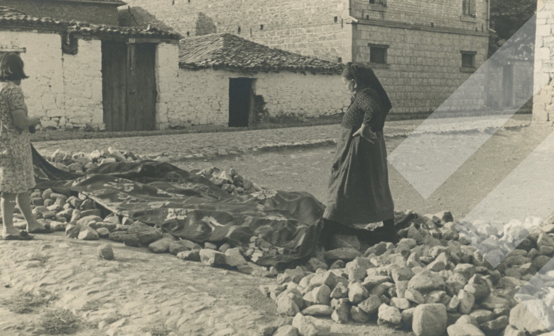 I panjohur, rreth 1940-1942 Duke shitur qilimin, Korçë print në letër, 9 x 14 cm.