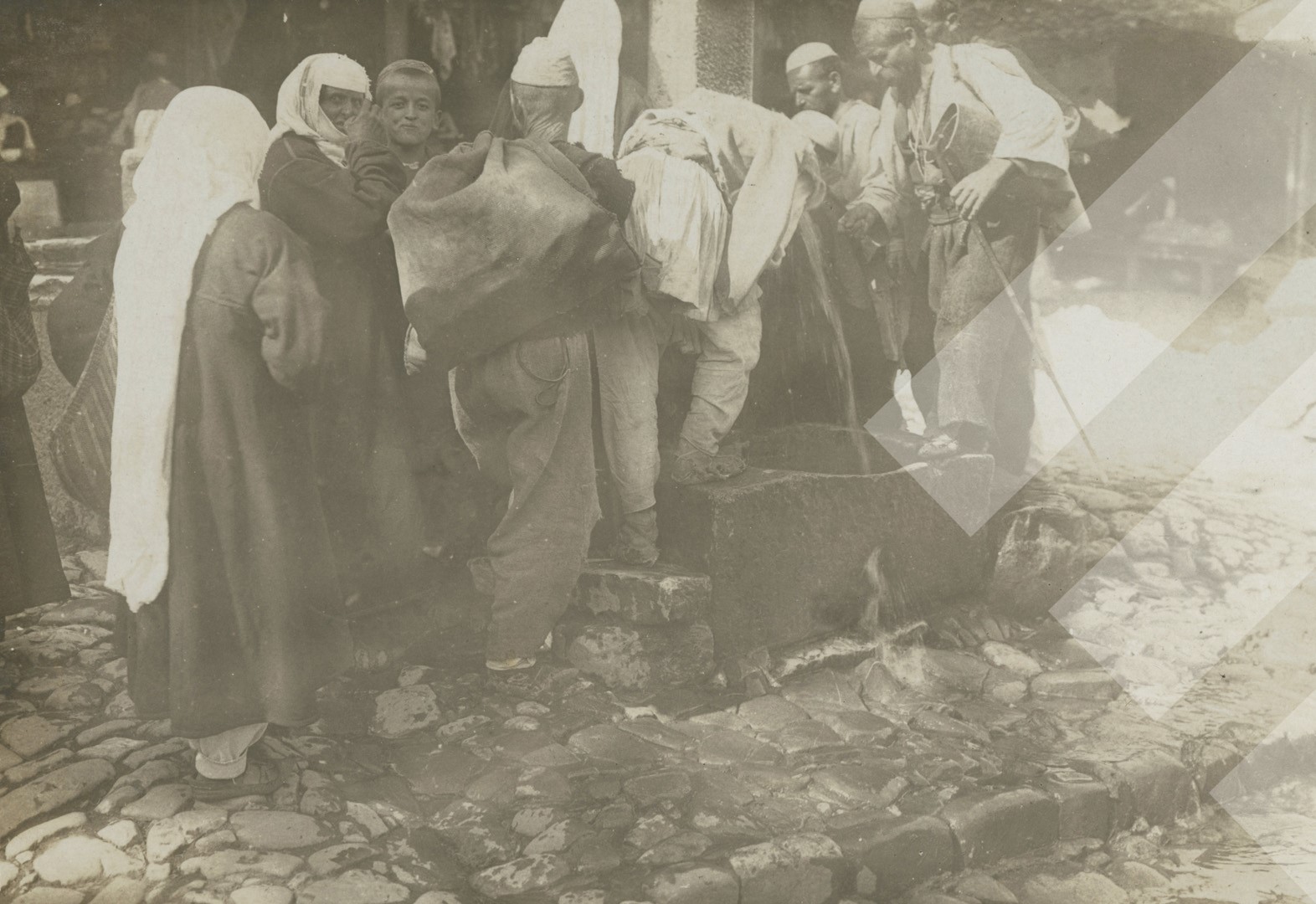 I panjohur, rreth 1916-1918 Radhë te një çezmë në Tiranë print në letër, 9 x 14 cm.