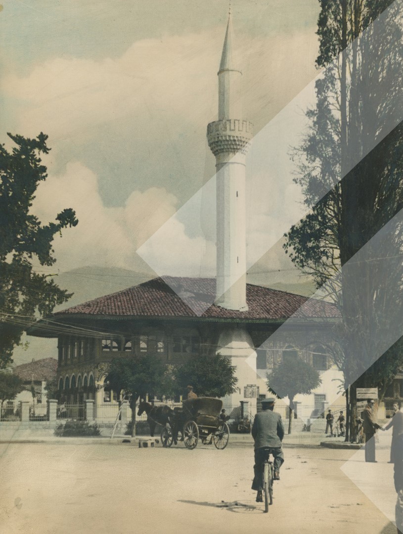 I panjohur, rreth 1930 Xhamia e Sulejman Pashës ose e njohur ndryshe si Xhamia e Vjetër e Tiranës print në letër i ngjyrosur, 17 x 23 cm.