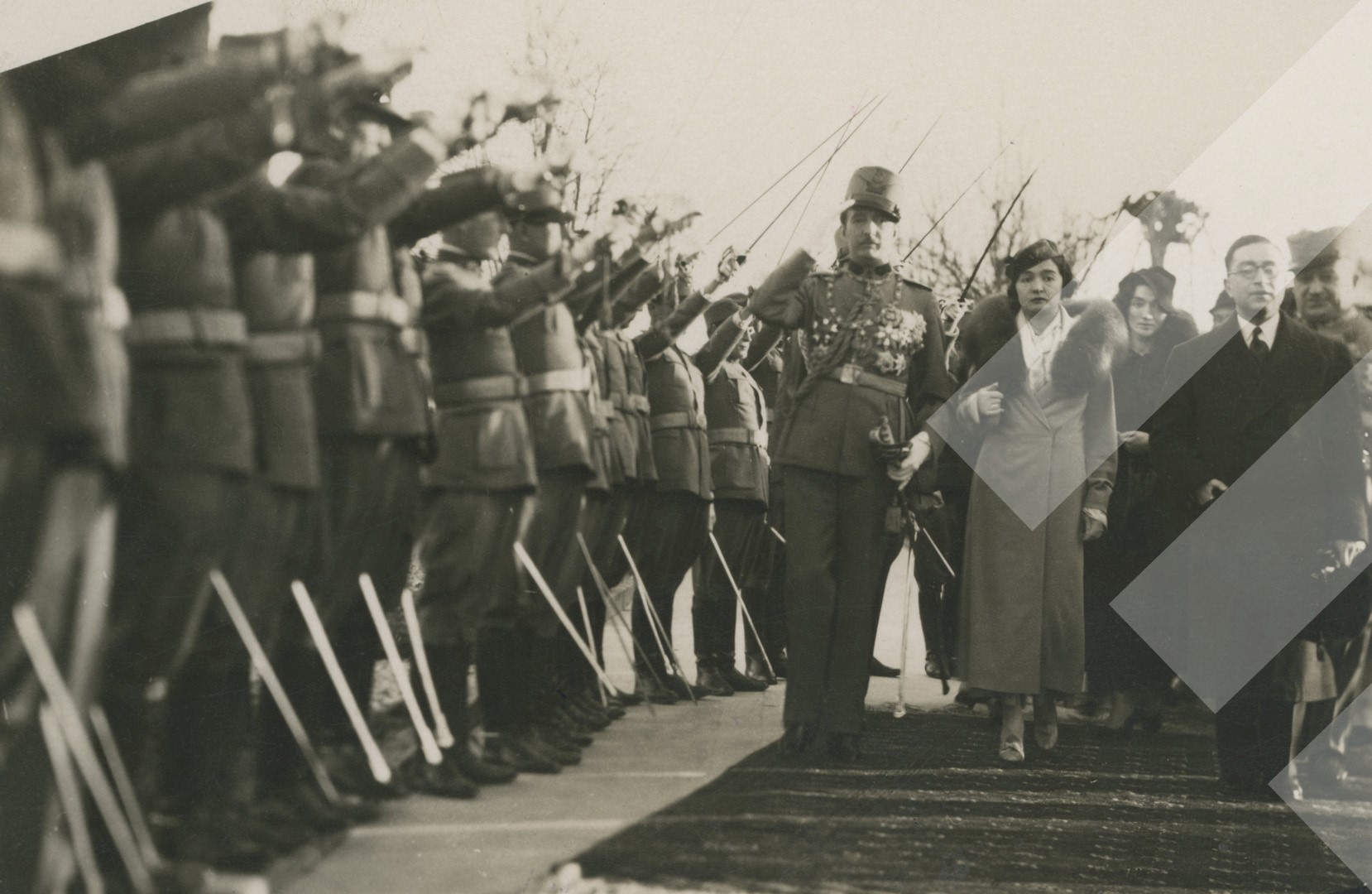 Kol Maca, rreth 1930, Mbreti Zog në një ceremoni, print në letër, 9 x 14 cm.