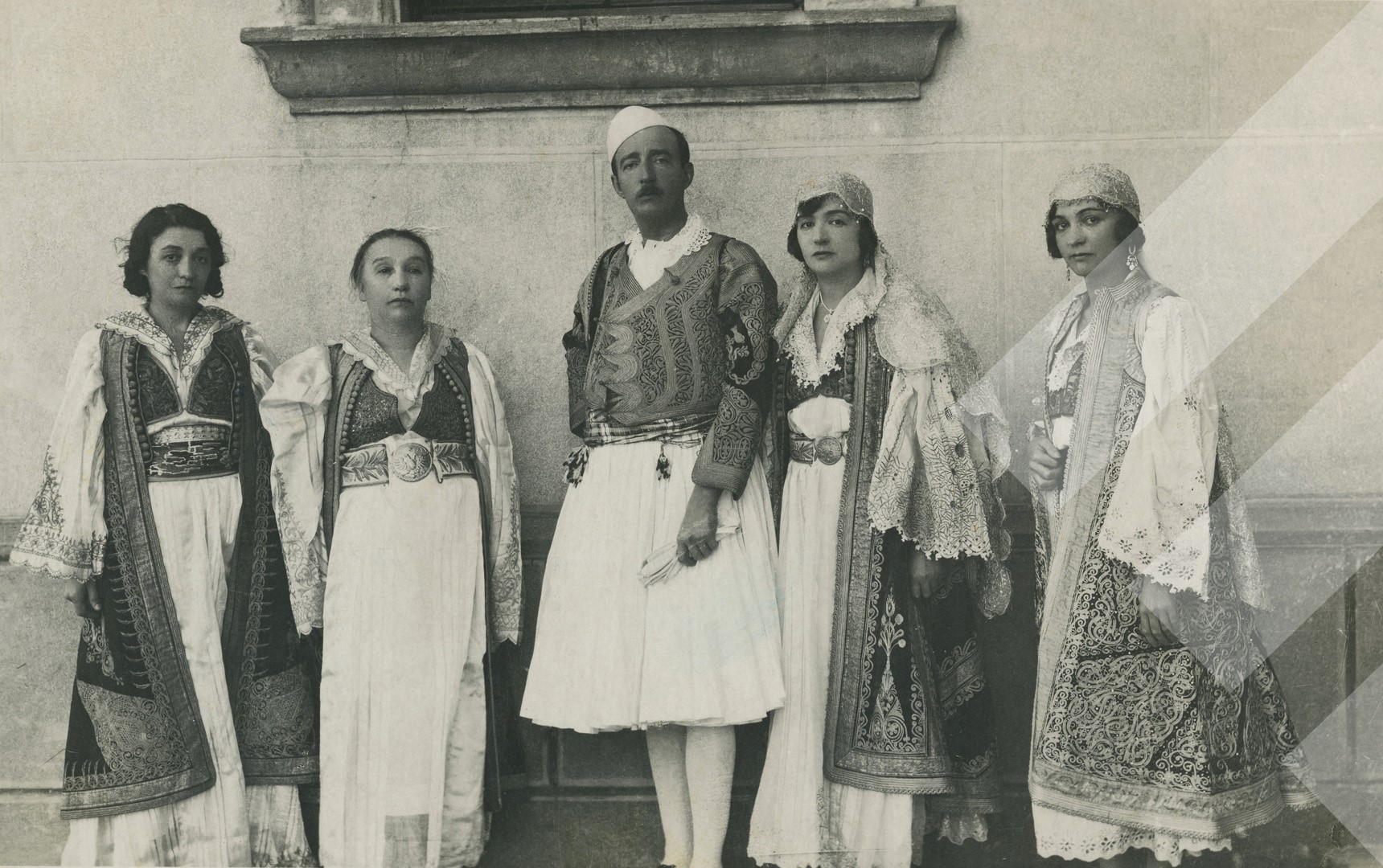 Kol Maca, 1930, Mbreti Zog me nënën mbretëreshë dhe tre motrat e tij me kostume kombëtare, print në letër, 9 x 14 cm.