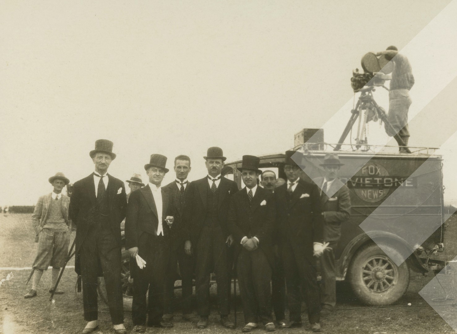 I panjohur, Ekipi i Fox News me automjetin dhe kamerën e tyre, shoqëruar nga autoritetet shqiptare dhe gazetari Nebil Çika gjatë vizitës së bërë me rastin e ditlindjes së Mbretit Zog në vitin 1929, print në letër, 9 x 14 cm.