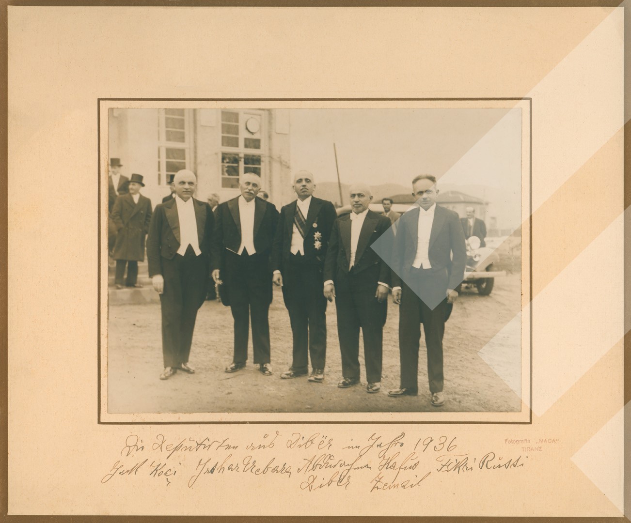 Kol Maca, 1936, Deputetët e Dibrës në pozë para Parlamentit, print në letër, 17 x 23 cm.
