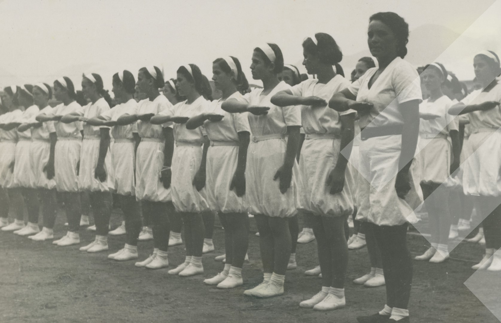 Foto Dajti, 1937, Një grup vajzash me uniforma sportive në festimin e 25-vjetorit të Pavarësisë, duke përshëndetur me nderimin Zogist, print në letër, 9 x 14 cm.
