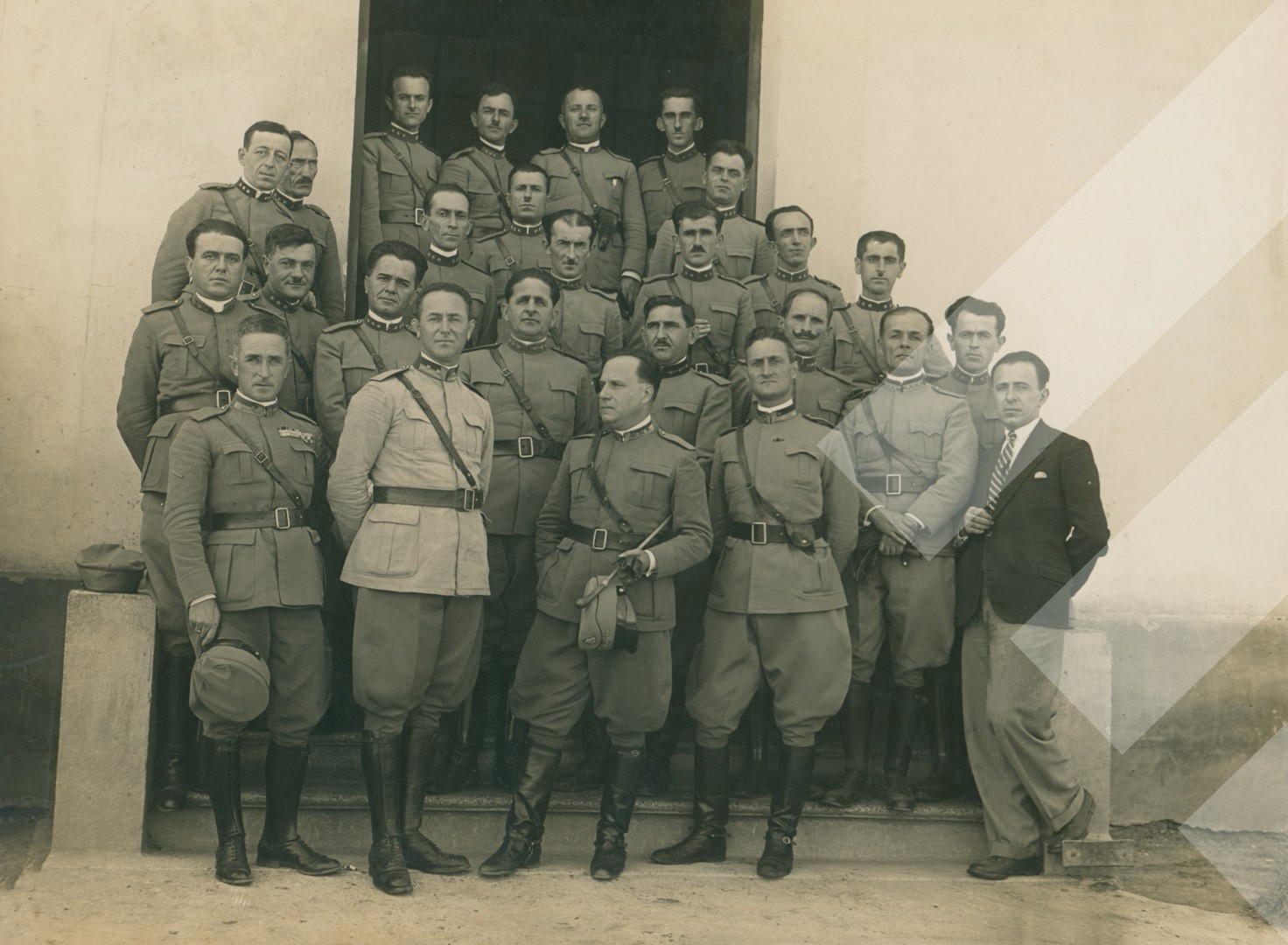 Kol Maca, 1931, Një grup oficerësh para shkollës së Perfeksionimit të Oficerëve në Tiranë. Në qendër Kapiten Ali Erebara, print në letër, 17 x 23 cm.