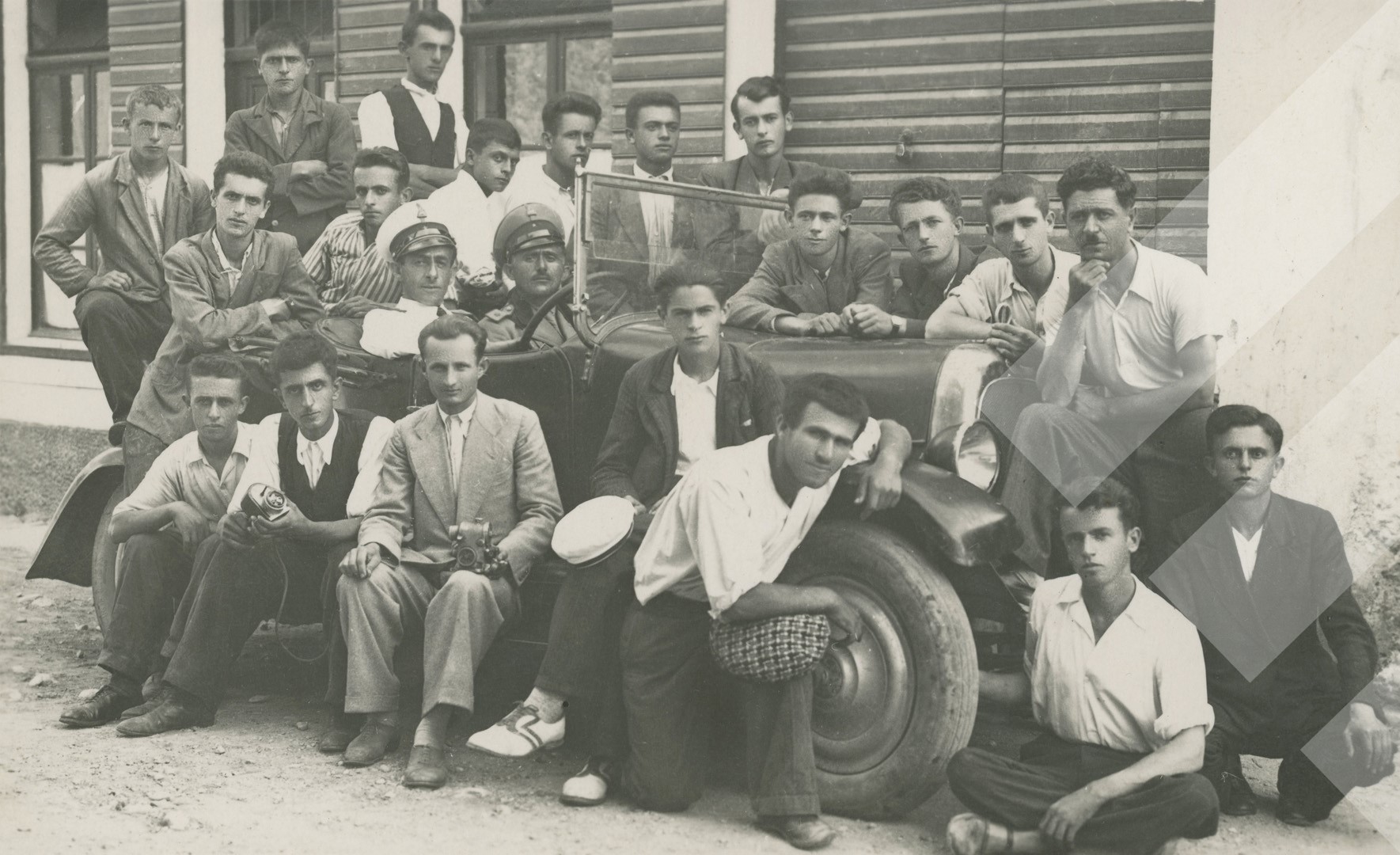 Shan Pici, rreth 1935, Grup të rinjsh rreth një automobili të Ushtrisë Shqiptare, print në letër, 9 x 14 cm.