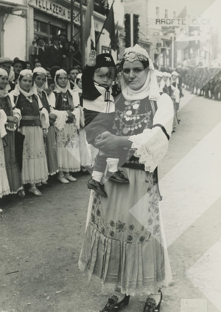 "LUCE", 1940, Grua nga Dropulli me fëmijën të veshur me uniformën e Balila-ve, duke nderuar në stil fashist, print në letër, 11 x 17 cm.