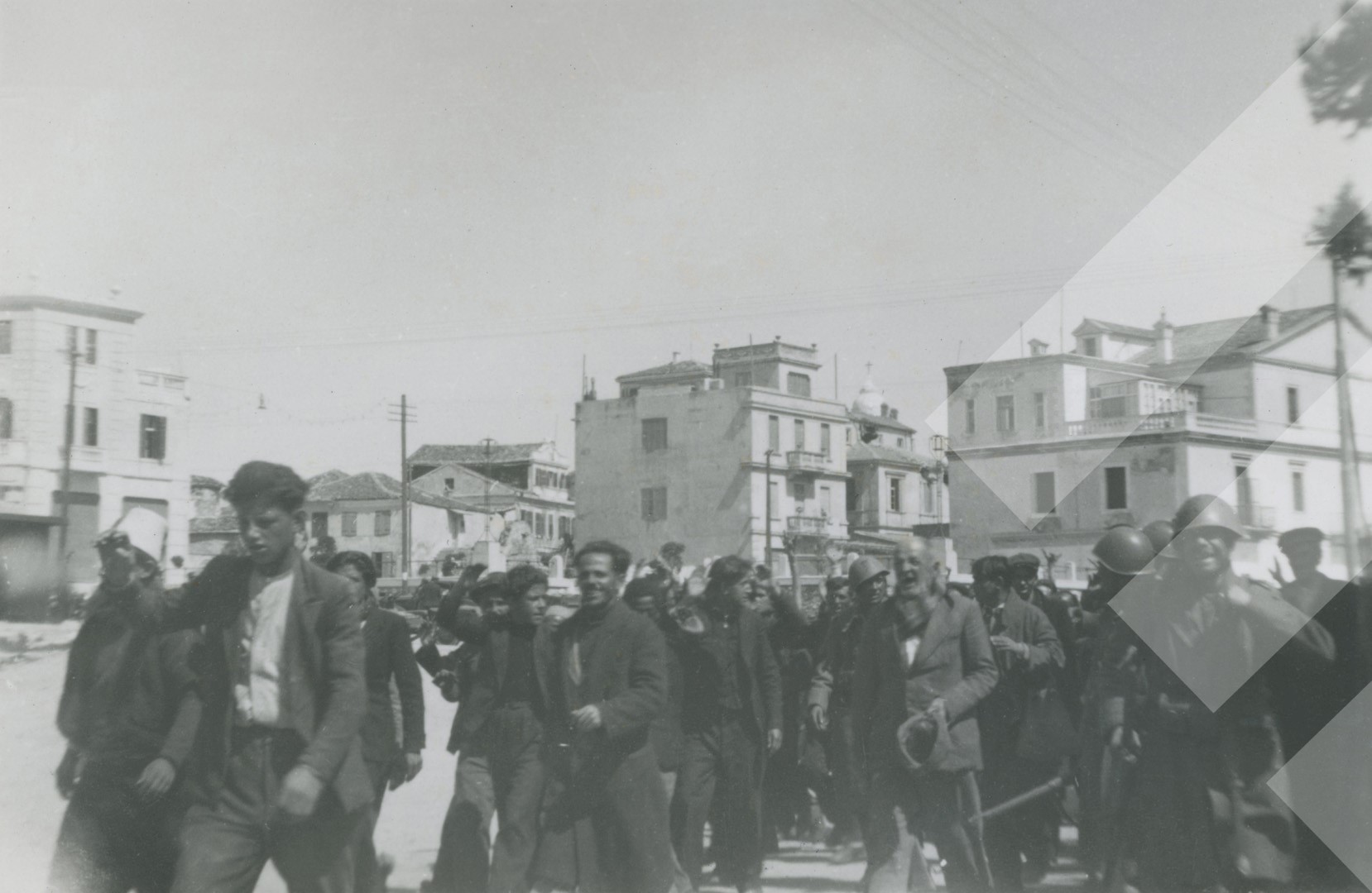 I panjohur, 1939, Banorë të Durrësit detyrohen të përshëndesin trupat fashiste. 7 Prill 1939, print në letër, 6 x 9 cm.