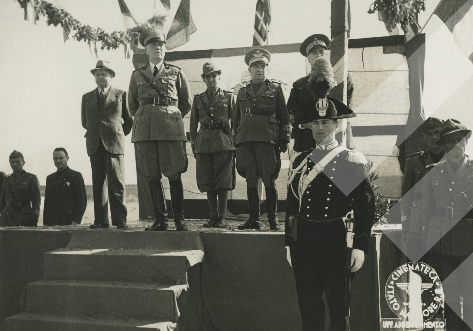 Cinemateca Stato Maggiore R.E, 1941, Në tribunë: Gjeneral Badoglio, Gjeneral De Georgis dhe Lejtnanti i Përgjithshëm i Trupave Italiane në Shqipëri Carlo Geloso, print në letër, 9 x 14 cm.