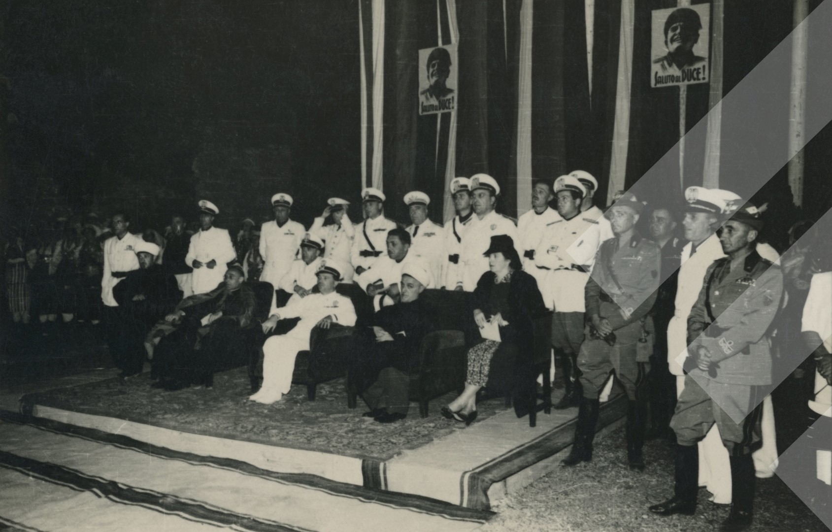 Geg Marubi, 1939, Maliq Bushati dhe ushtarakë Italianë gjatë një shfaqe në Shkodër, print në letër, 9 x 14 cm.