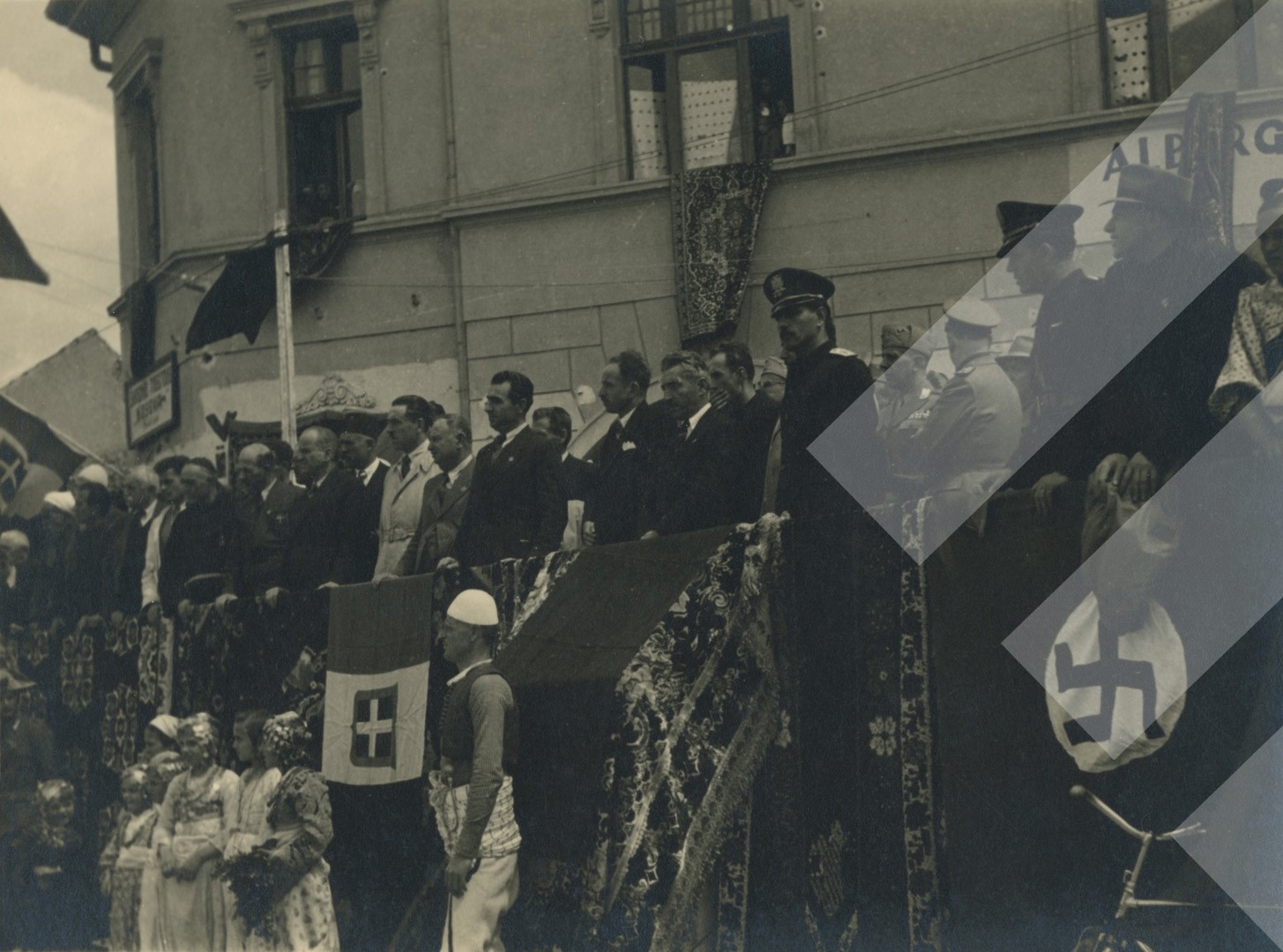 I panjohur, 1941, Manifestim në Prishtinë për Ditën e Flamurit. Në tribunë krerët e Kosovës: Bedri Pejani, Hysen Prishtina. 28 Nëntor 1941, print në letër, 9 x 11 cm.