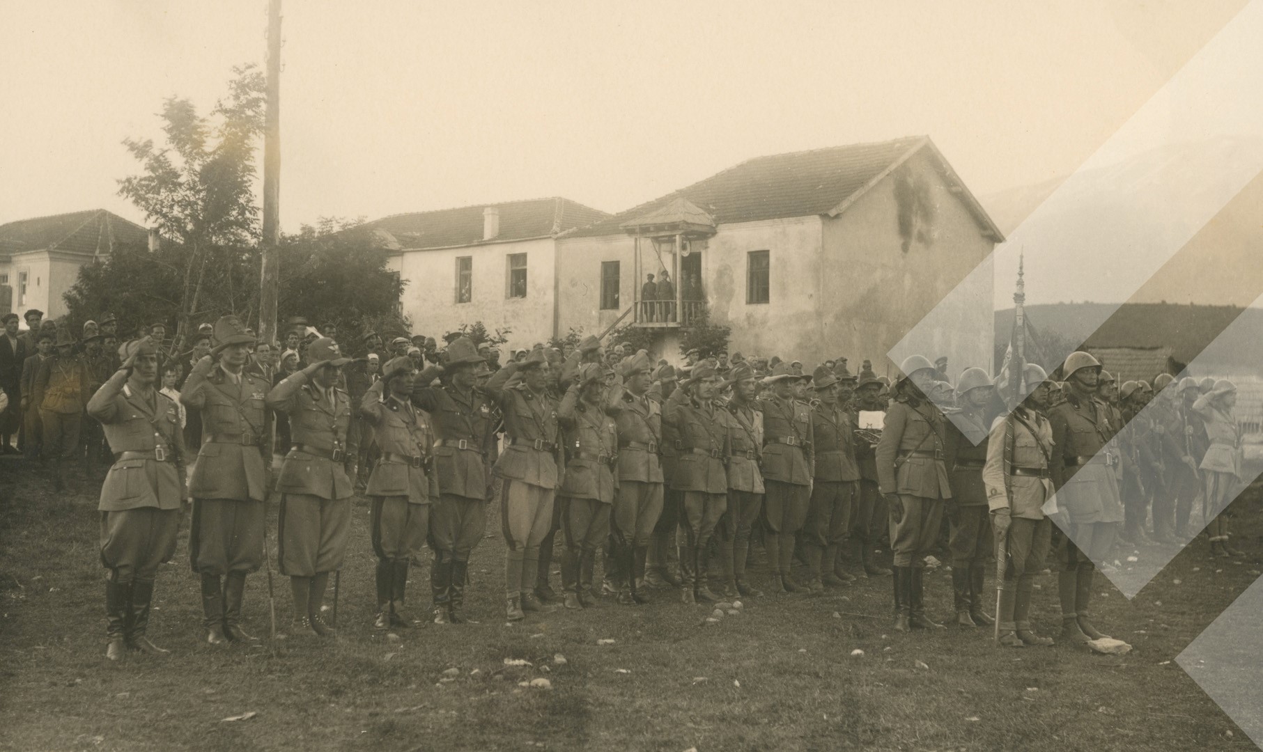 Foto "SHARR" (Muharem Asllani & Raif Eqerem), 1939, Trupat italiane në Kukës. 19 Maj 1939, print në letër, 9 x 14 cm.