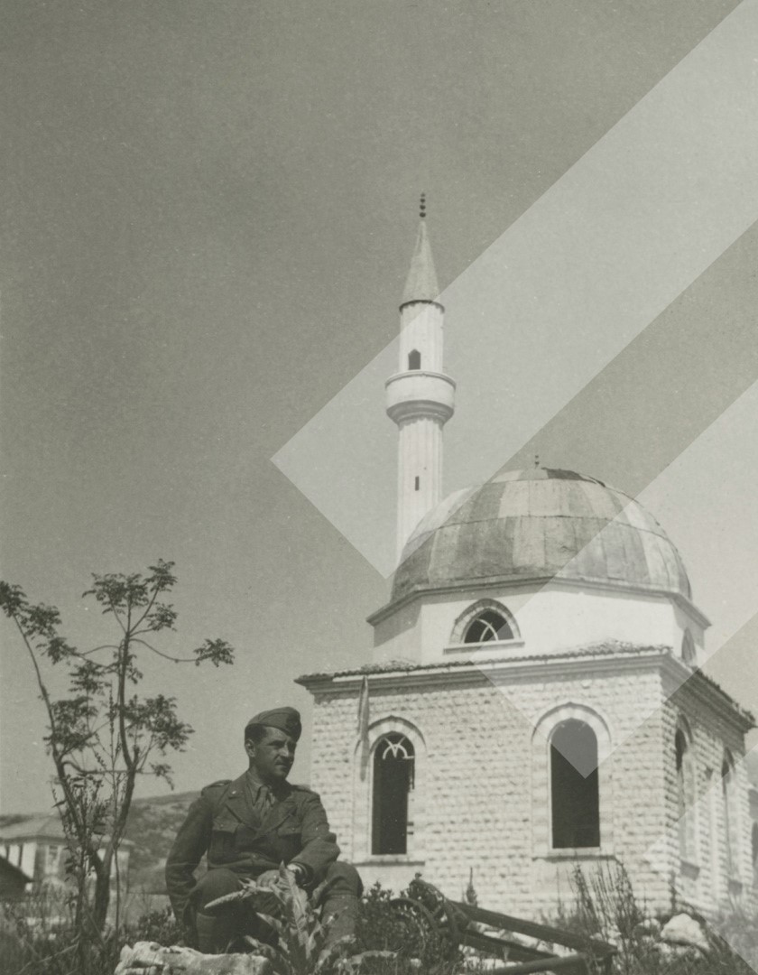 I panjohur , "", 1941 , , Ushtar Italian në pozë para xhamisë së Sarandës, , print në letër , 4 x 6 cm