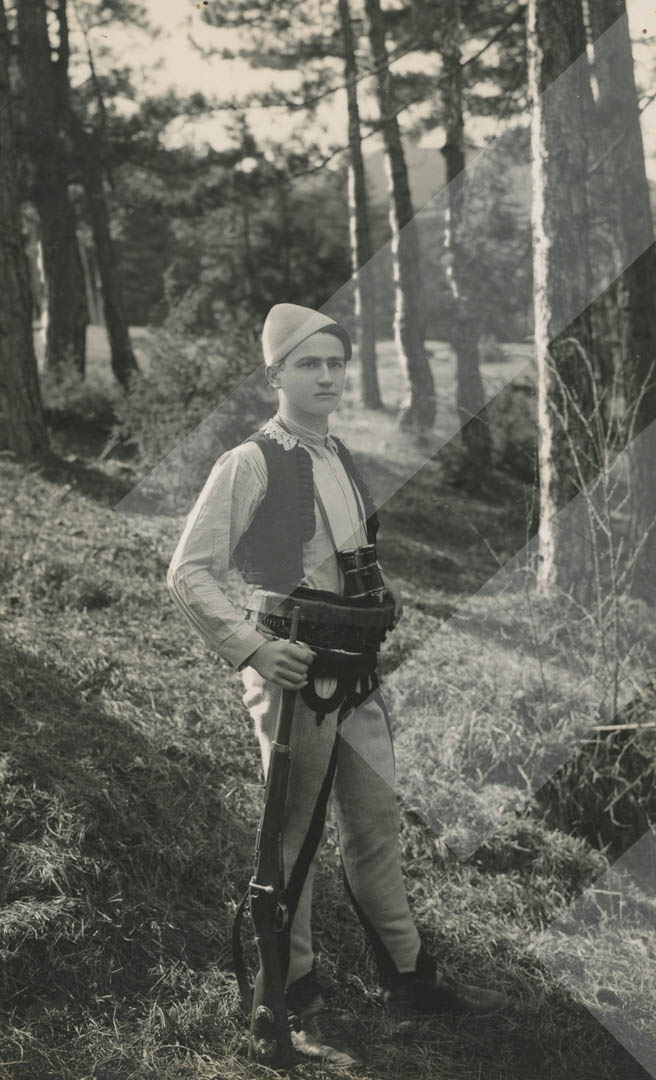 I panjohur, rreth 1940-1944,, Djalosh kosovar në pozë me armë,, print në letër, 9 x 14 cm.