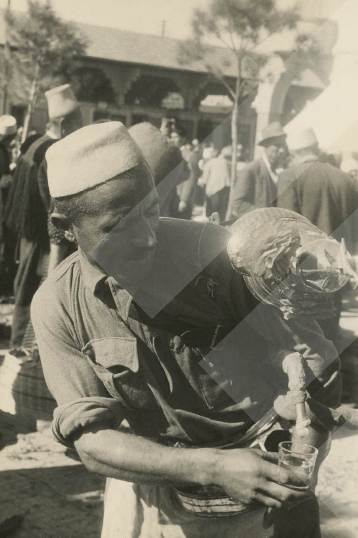 I panjohur, 1940,, Shitës uji në pazarin e Tiranës,, print në letër, 7 x 10 cm.