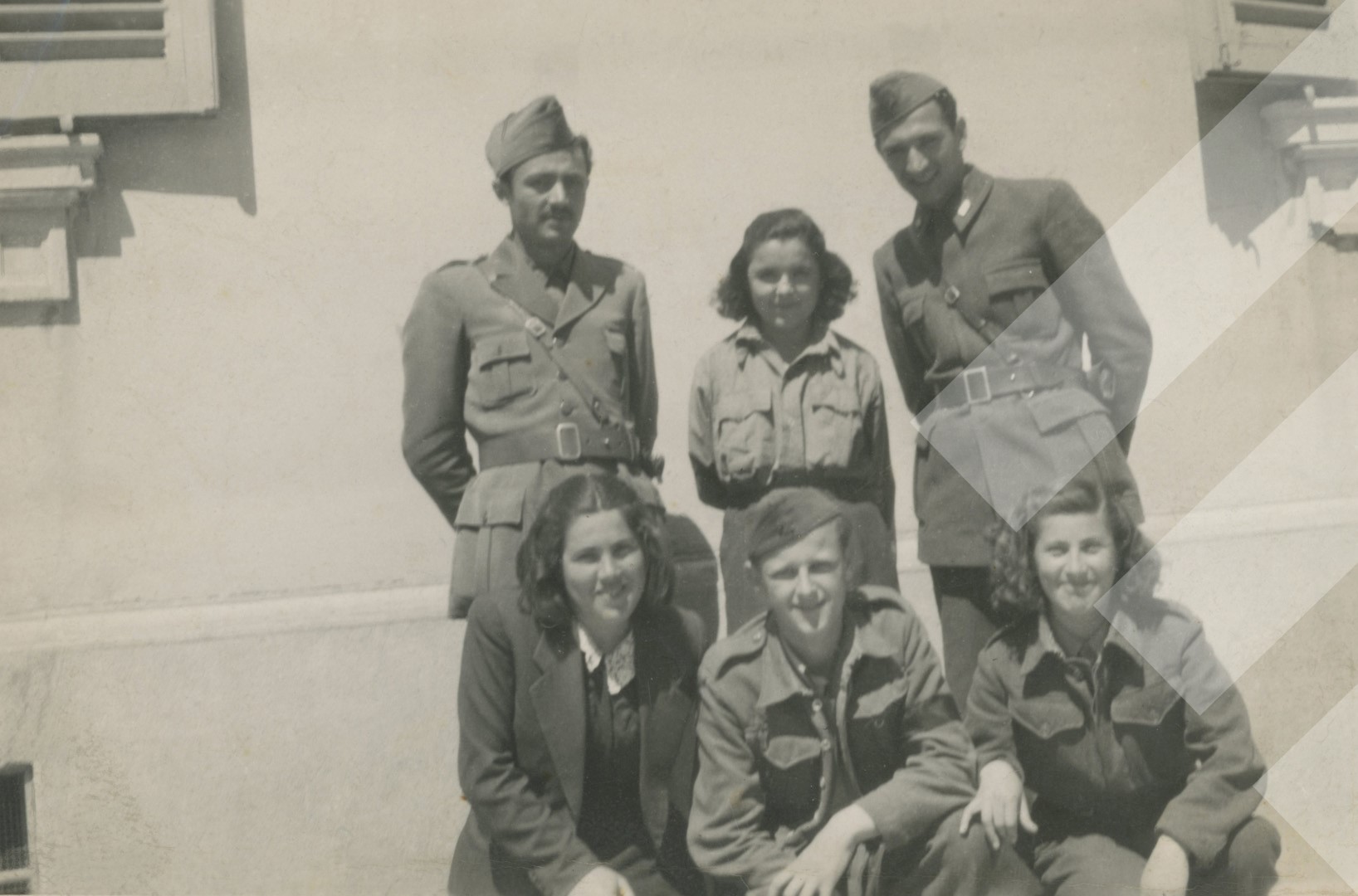 I panjohur, 1945, Partizanë dalë përpara hotel "Kontinental", Tiranë, print në letër, 6 x 9 cm.