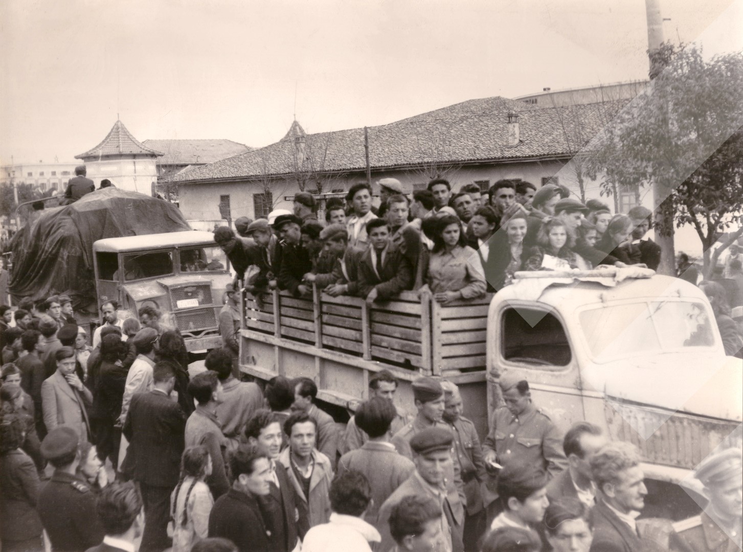 I panjohur, rreth 1945-1946, Të rinj mbi kamion, Tiranë, print në letër, 13 x 18 cm.