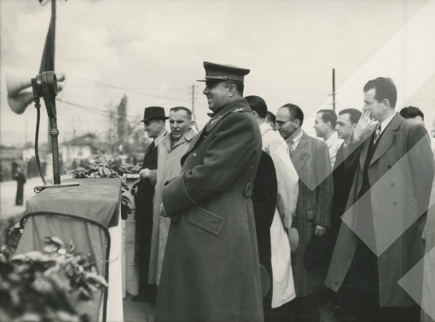 I panjohur, rreth 1945-1946, Enver Hoxha në një ceremoni festive, print në letër, 9 x 14 cm.