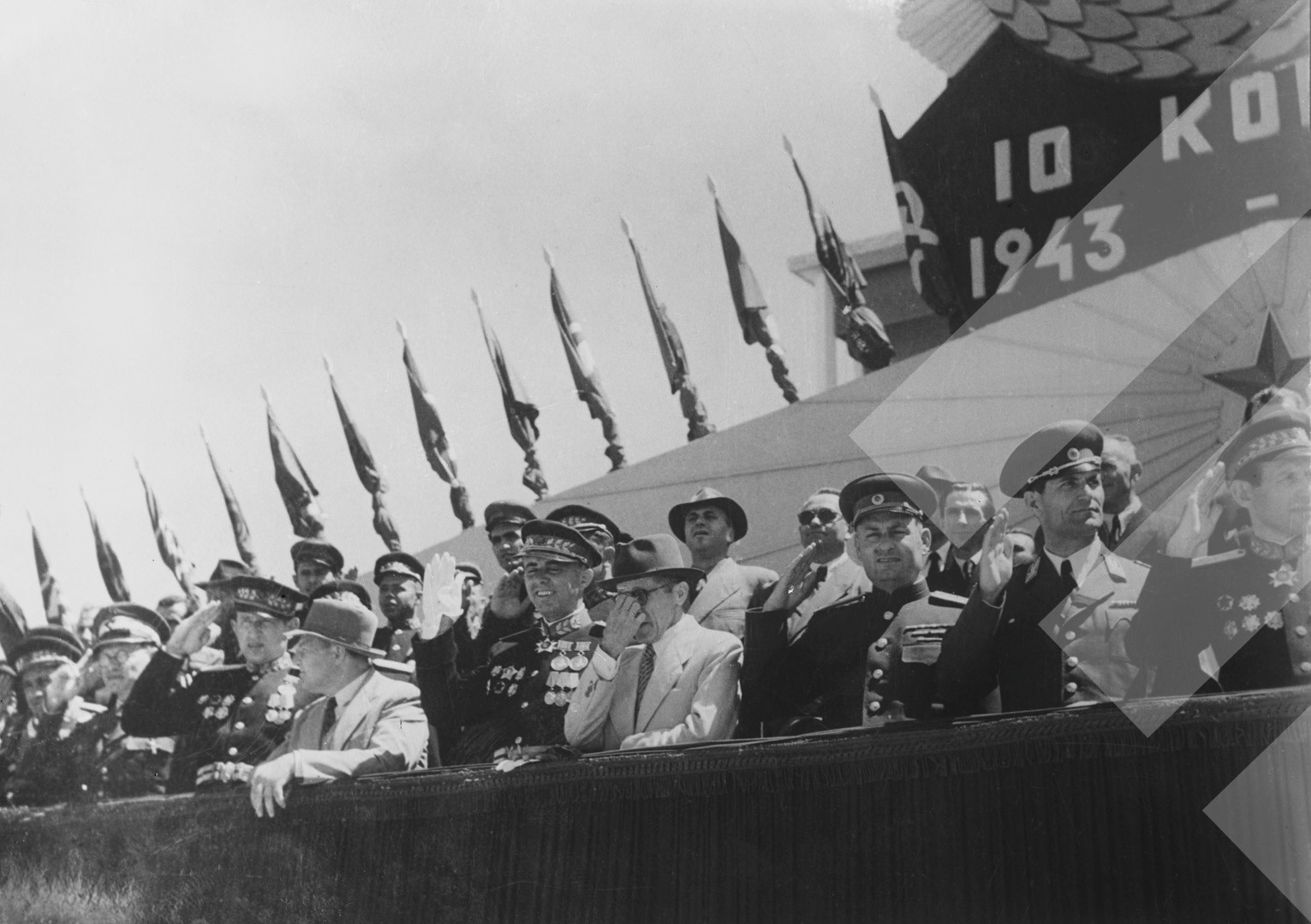 I panjohur , "", rreth 1949-1950 , , Enver Hoxha dhe anëtarë të byrosë politike përshëndesin trupat në parakalim, Tiranë , , pllakë xhami , 13 x 18 cm