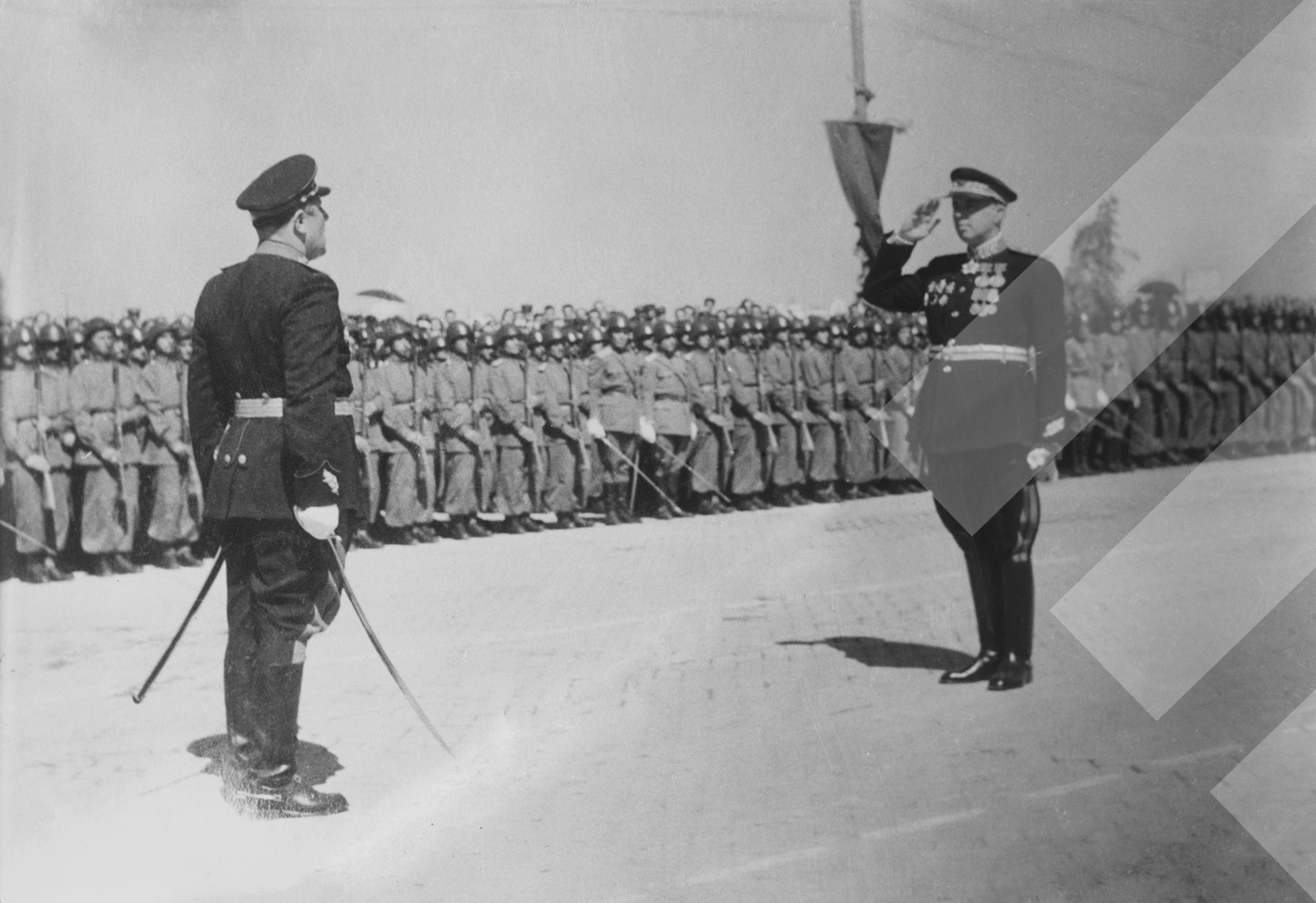 I panjohur , "", rreth 1949-1950 , , Kryetari i Shtatmadhorisë Beqir Balluku paraqet forcën para Komandantit të Përgjithshëm Enver Hoxha, Tiranë, , pllakë xhami , 13 x 18 cm