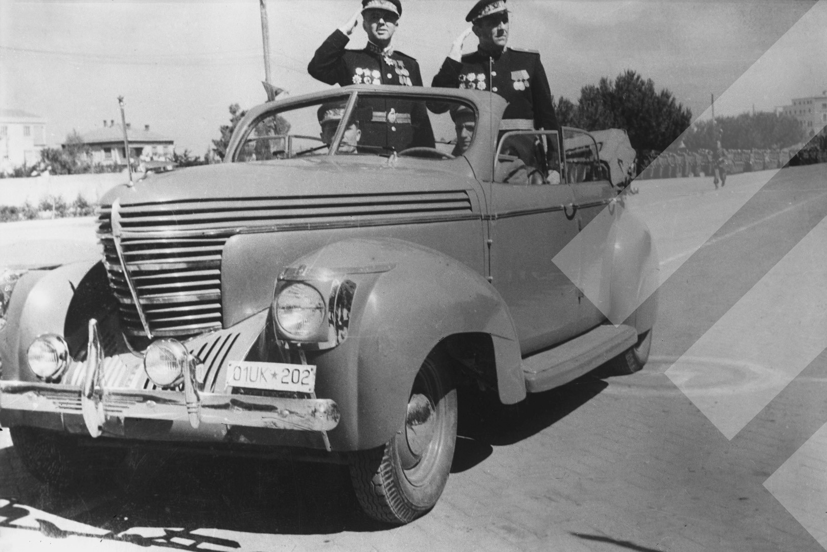I panjohur , "", rreth 1949-1950 , , Komandanti i Përgjithshëm Enver Hoxha dhe Kryetari i Shtatmadhorisë Beqir Balluku nderojnë trupën ushtarake, Tiranë , , pllakë xhami , 13 x 18 cm