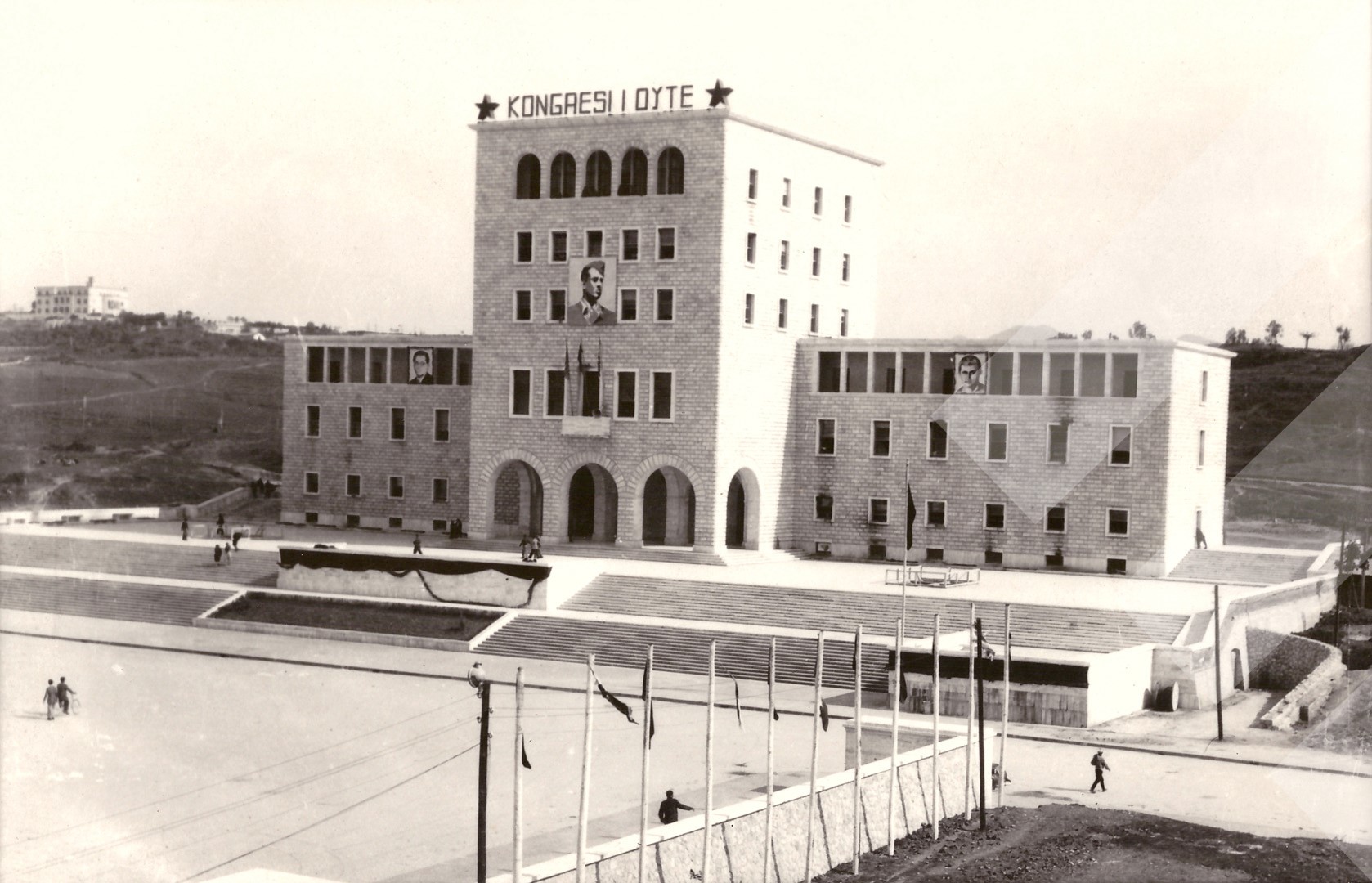 I panjohur , "", 1952 , , Pamje e Universitetit të dekoruar për Kongresin e II të Partisë, Tiranë , , print në letër , 6 x 9 cm