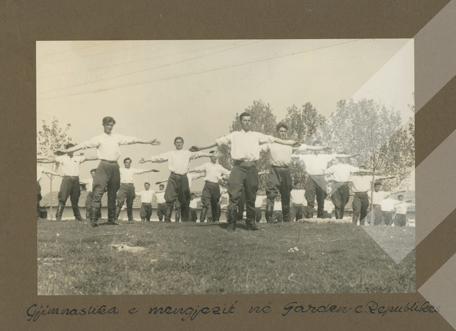 I panjohur rreth 1960, Garda e Republikës gjatë gjimnastikës së mëngjesit, print në letër, 12 x 18 cm.
