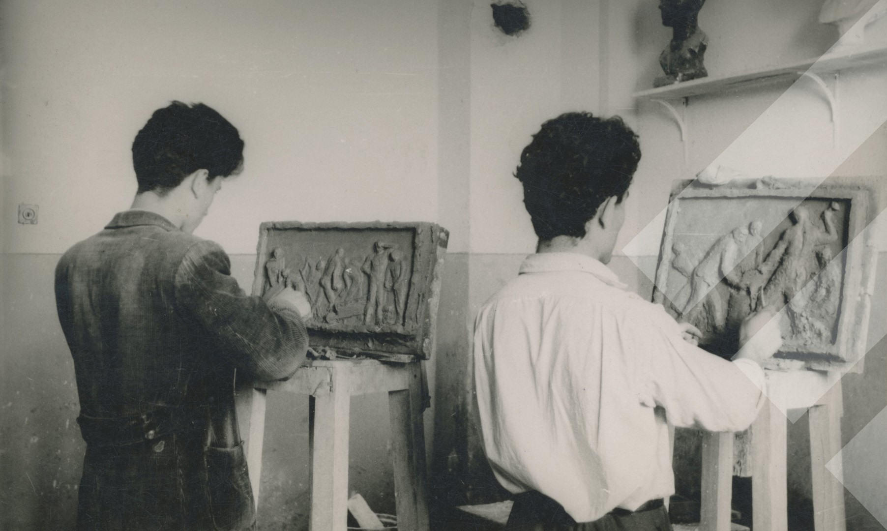 I panjohur , "", rreth 1965 , , Studentë ne atelienë e skulpturës në Shkollën e Arteve, Tiranë, , print në letër , 7 x 14 cm