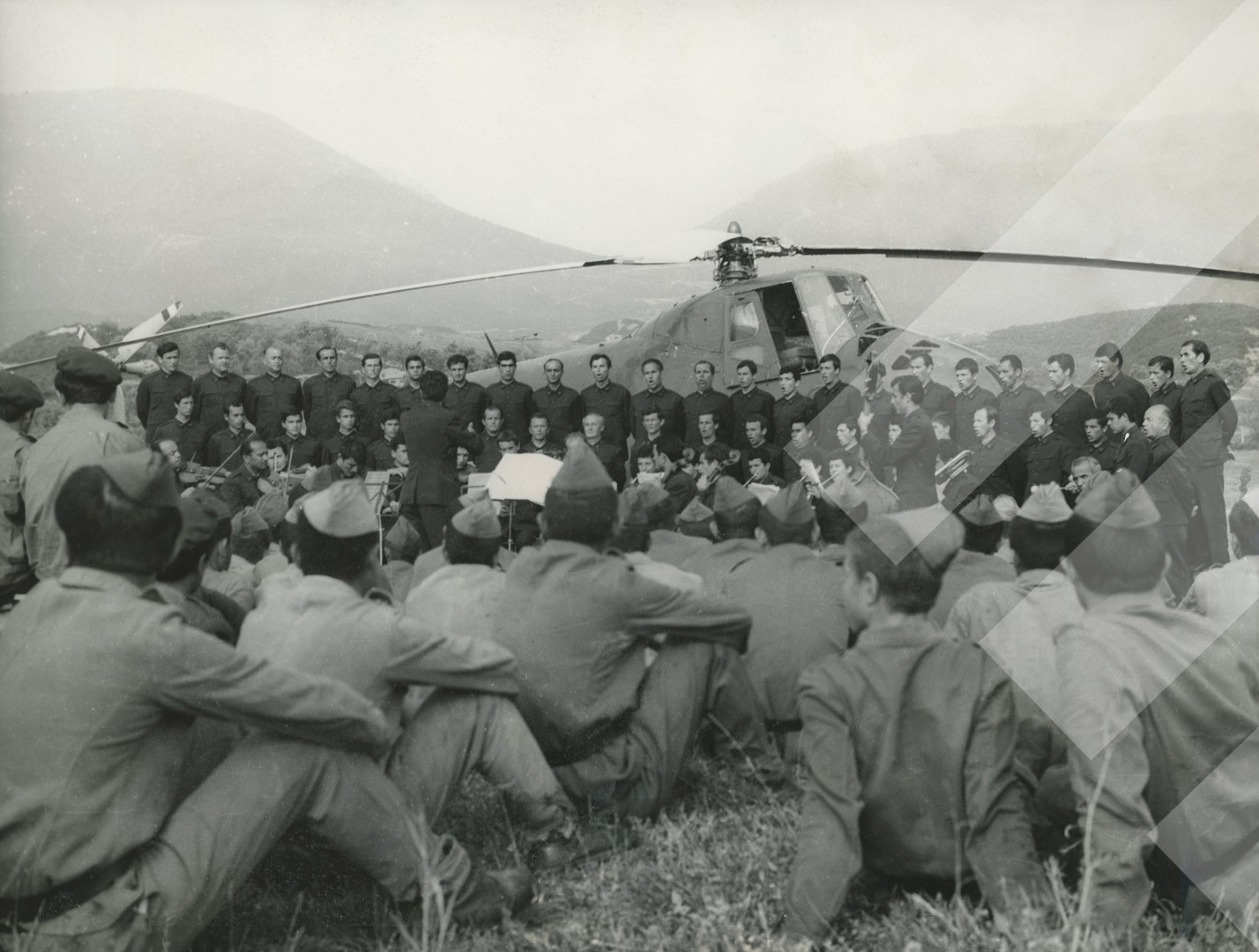 I panjohur , "", rreth 1980-1985 , , Orkestra dhe kori i ushtrisë në një shfaqje, , print në letër , 18 x 24 cm
