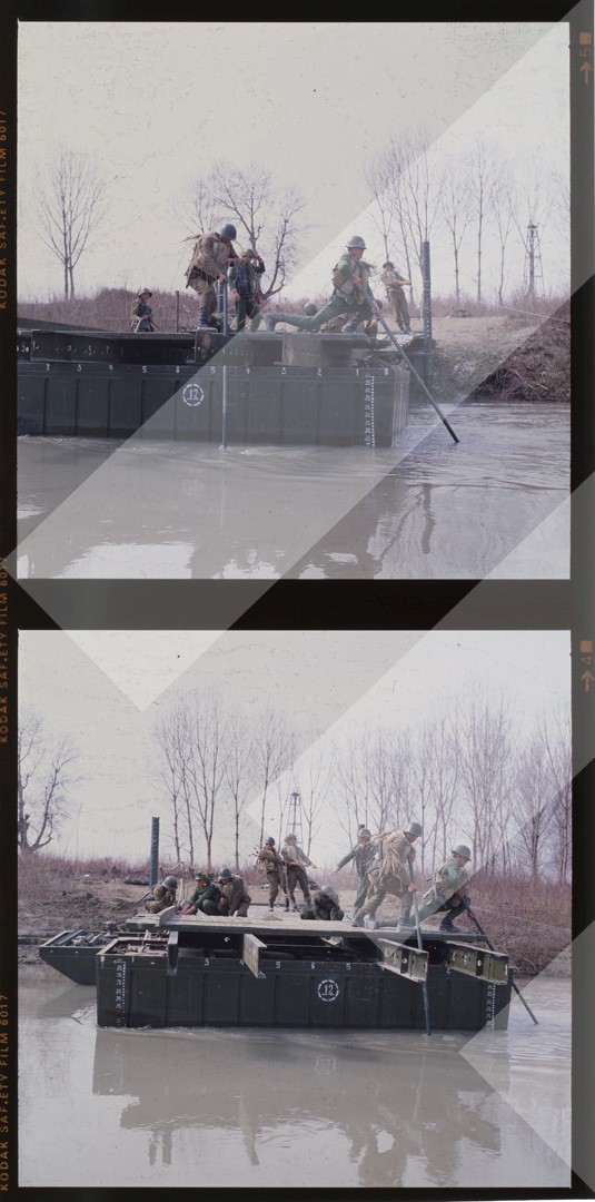 I panjohur, rreth 1980, Reparti xhenier në aksion, diapozitiv, 6 cm x 6 cm.