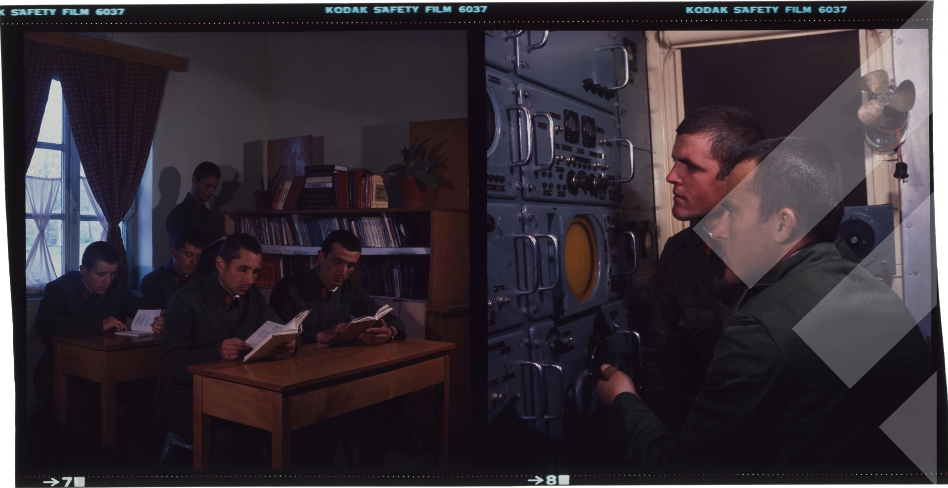 I panjohur, rreth 1980, a) Ushtarë në bibliotekë. b) Radistë në punë., diapozitiv, 6 x 6 cm.