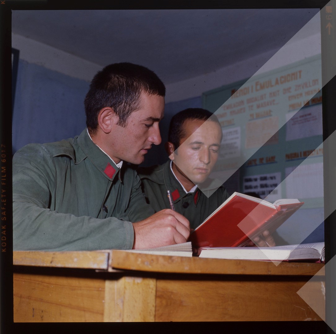 I panjohur, 1984, Ushtarë duke lexuar veprat e shokut Enver, diapozitiv, 6 x 6 cm.