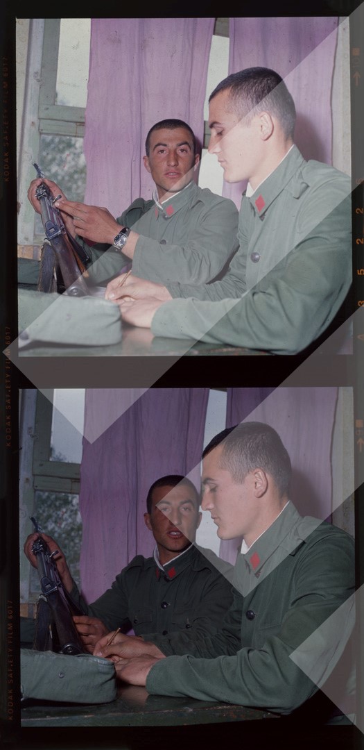 I panjohur, 1984, Ushtarë duke studiuar armët, diapozitiv, 6 x 6 cm.