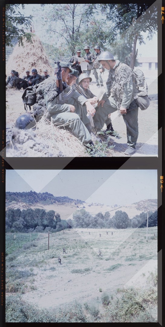 I panjohur, 1984, a) Ushtarë lexojnë shtypin. b) Ushtarë në stërvitje., diapozitiv, 6 x 6 cm.