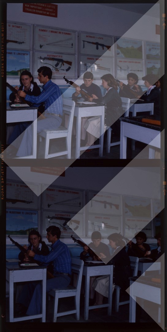 I panjohur, 1984, Nxënës në orën e edukimit ushtarak, diapozitiv, 6 x 6 cm.