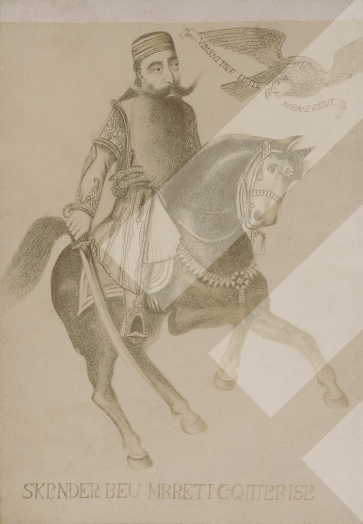 Petro Dhimitri, rreth 1895-1900, Vizatim i Skënderbeut mbi kalë, print në letër, 10 x 15 cm.