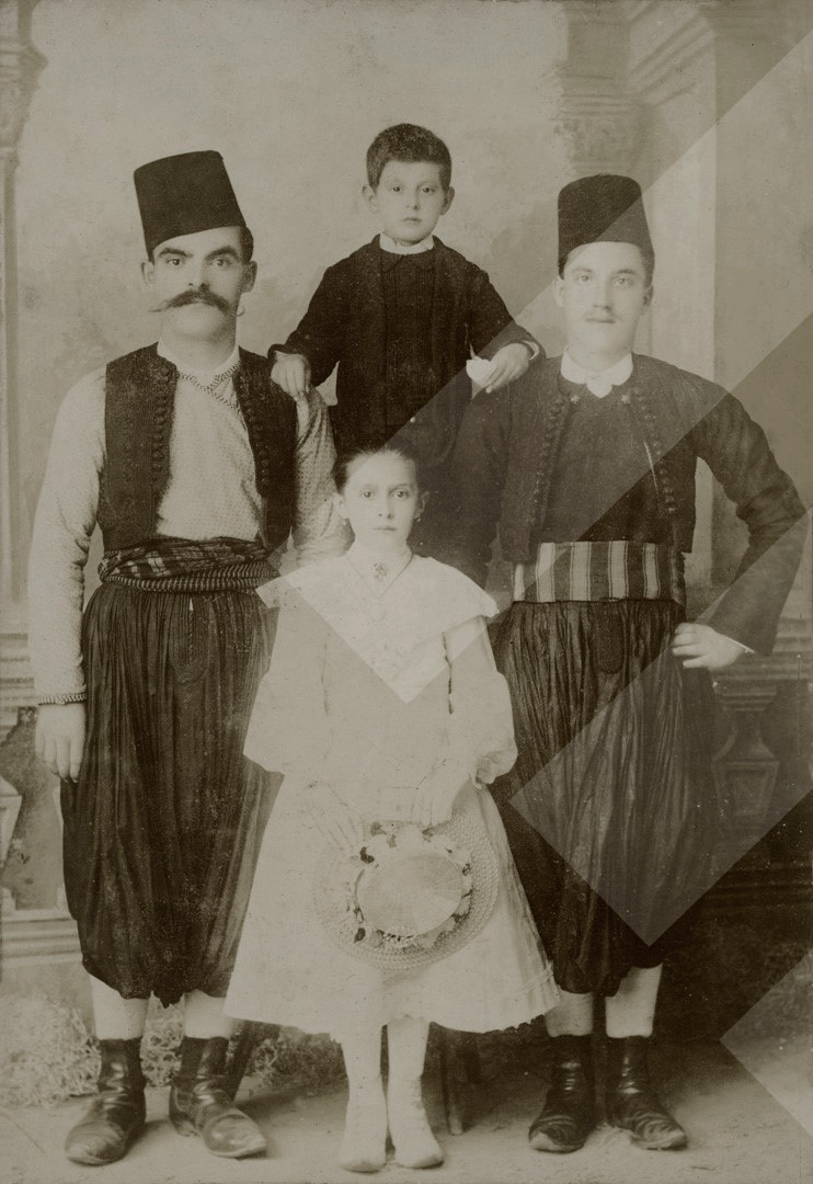 Kel Marubi, rreth 1900, Gjon Mala, Loro Dema, Palok Jubani dhe Lezina e Gjon Demës, print në letër, 10 x 14.5 cm.