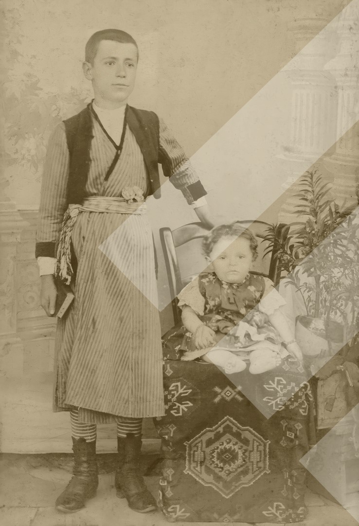 Kristo Sulidhi, rreth 1900-1910, Motër e vëlla në pozë, Korçë, print në letër, 8 x 12.5 cm.