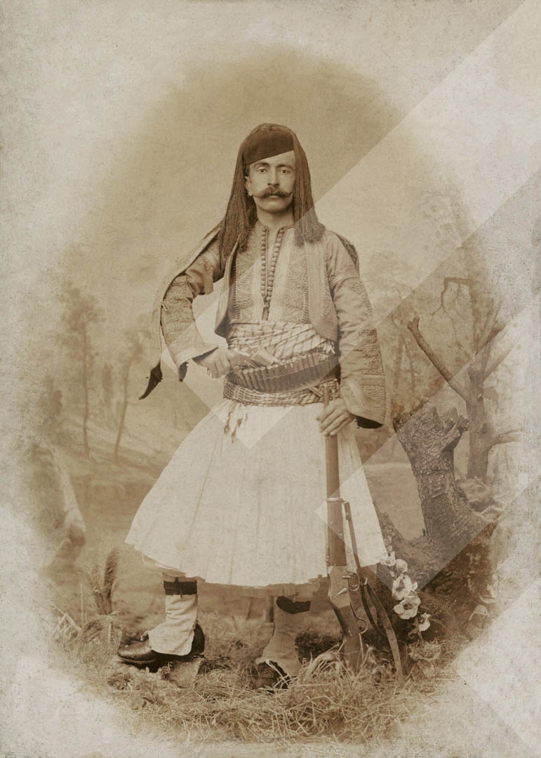 I panjohur, rreth 1880-1890,, Ali Riza Beu në pozë me armë,, print në letër, 13 x 18 cm.