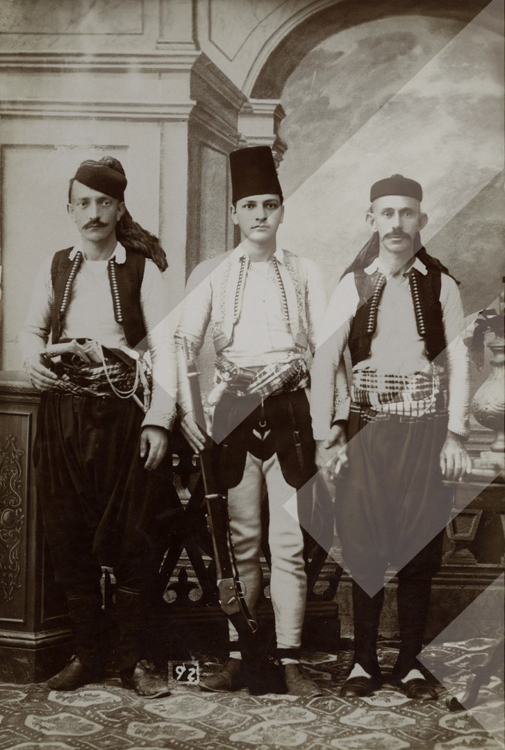 Kel Marubi, rreth 1900-1910, Tre të rinj Shkodranë në studio, print në letër, 10 x 15 cm.