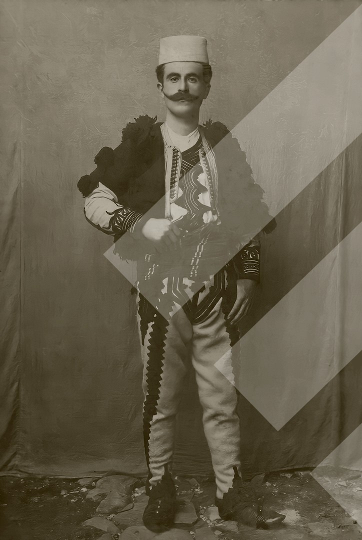 Petro Dhimitri, 1912, Muço Qulli me kostum kombëtar, print në letër, 10 x 15 cm.