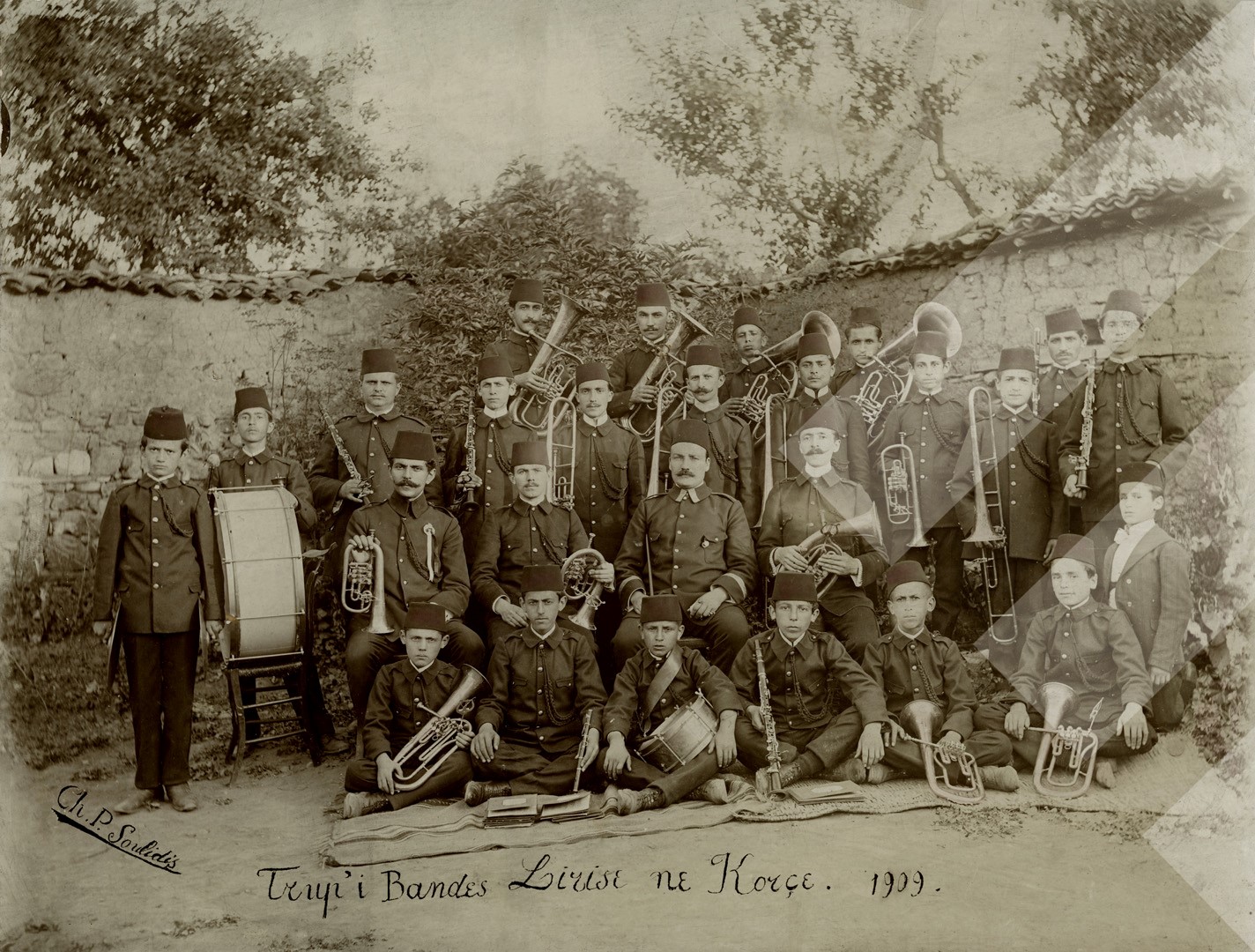 Kristo Sulidhi, 1909, Trupa e bandës muzikore "Liria" në Korçë, print në letër, 20 x 26 cm.