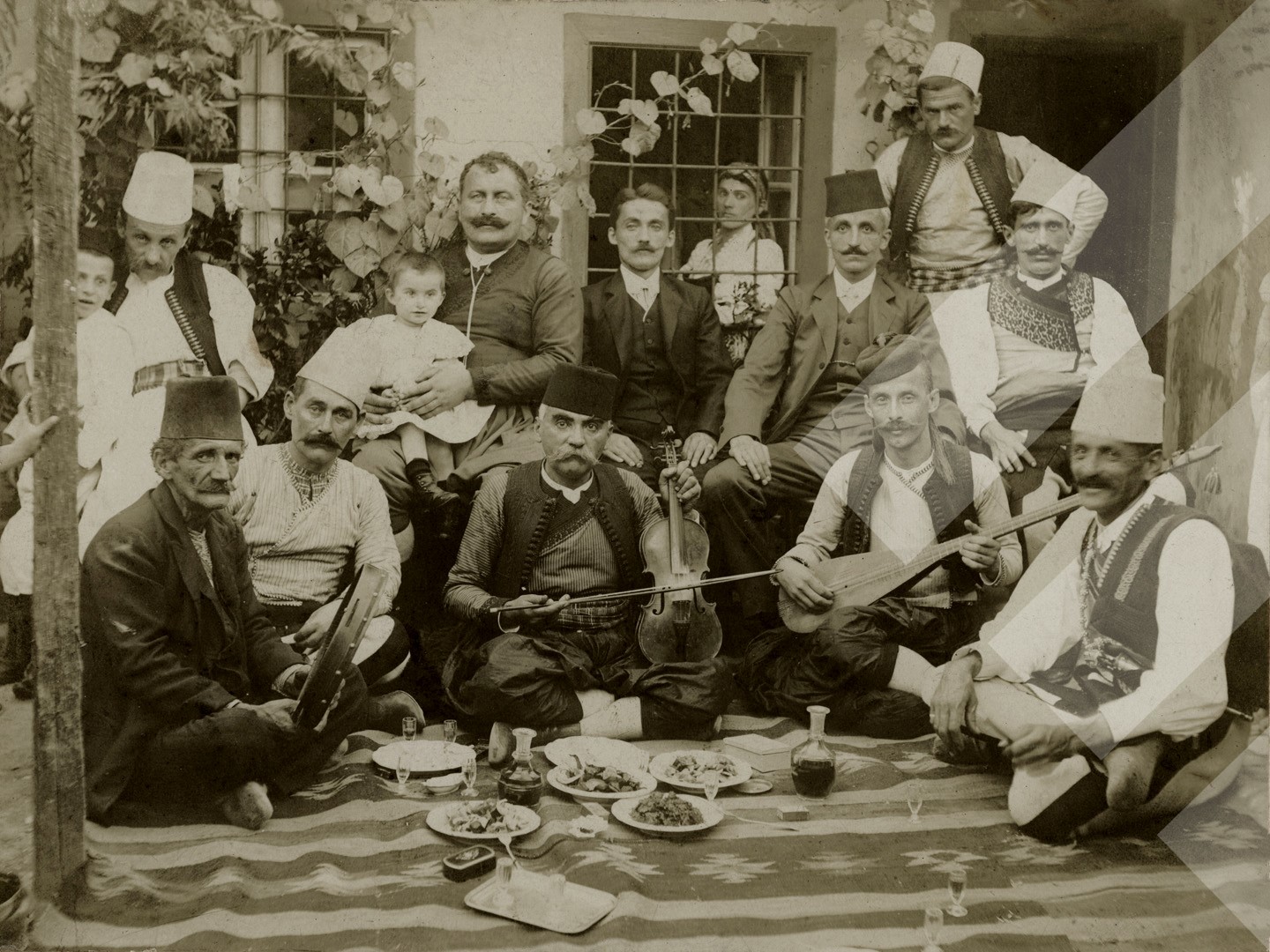 Kol Maca, rreth 1901-1905, Muzikantë shkodranë në oborrin e një shtëpie, print në letër, 11.5 x 15.5 cm.