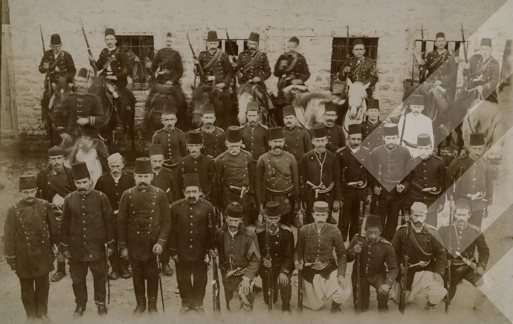 I panjohur, rreth 1895-1900, Grup ushtarësh osmanë dhe rekrutë shqiptarë, print në letër, 18 x 27 cm.